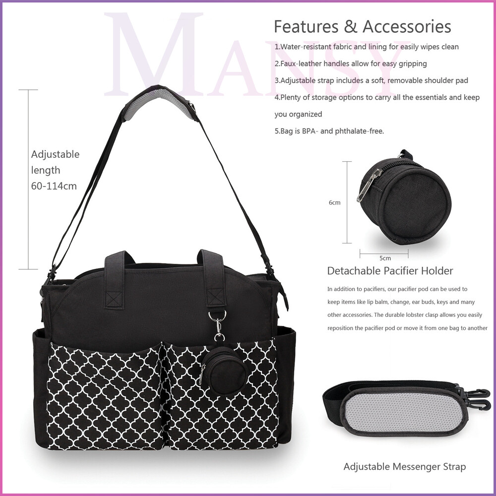 The package contains: 1*diaper bag, 1*Pacifier Case, 1*Adjustable Messenger Strap