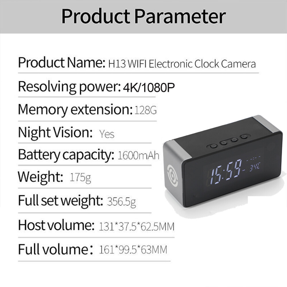 Specification: Name: Wifi electronic clock camera Resolution: 4K/1080P Memory expansion: 128G (not included) Night Vision: Support Battery capacity; 1600mah (included) Weight: 175g Size: 131*37.5*62.5mm