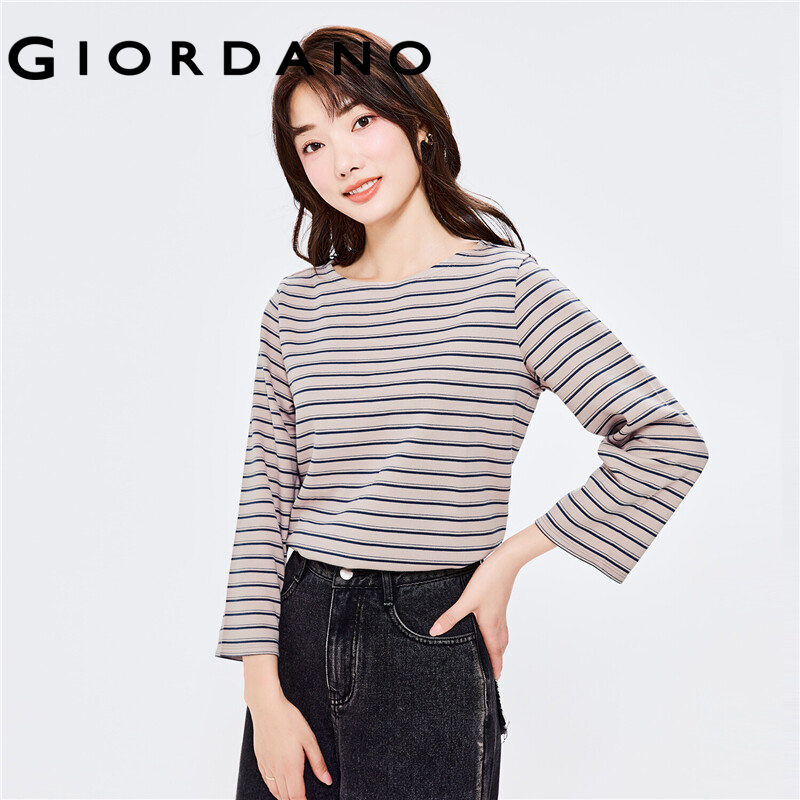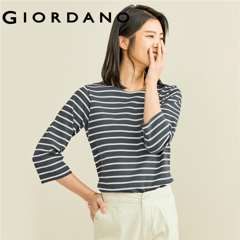 GIORDANO Women T-Shirts Interlock Coat Neck Casual T-Shirts 3/4 Sleeve Simple Basic Solid Color Stripe Design T-Shirts 05322629