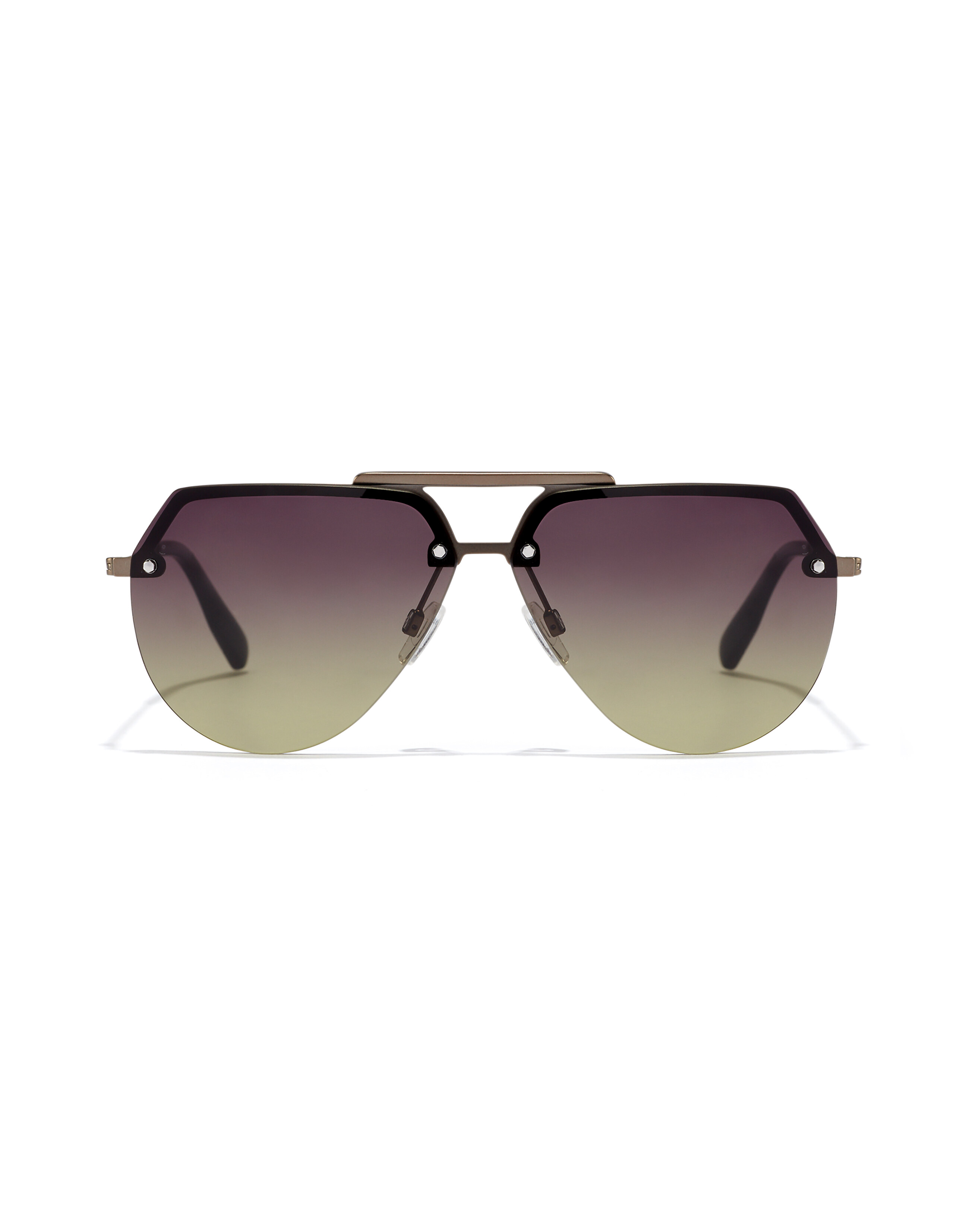 This rimless model is Inspired by the teardrop aviator style. The matt gunmetal frame has a bold upper bridge and the gradient moss lenses feature angular cuts at the temple and stud detailing to set the design apart from the norm.