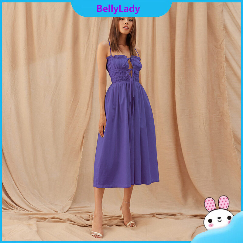 Women Suspender Dress Sexy Lace-up Hollowed-out Midi Skirt Fashion Solid Color High Waist Ruffled Dress