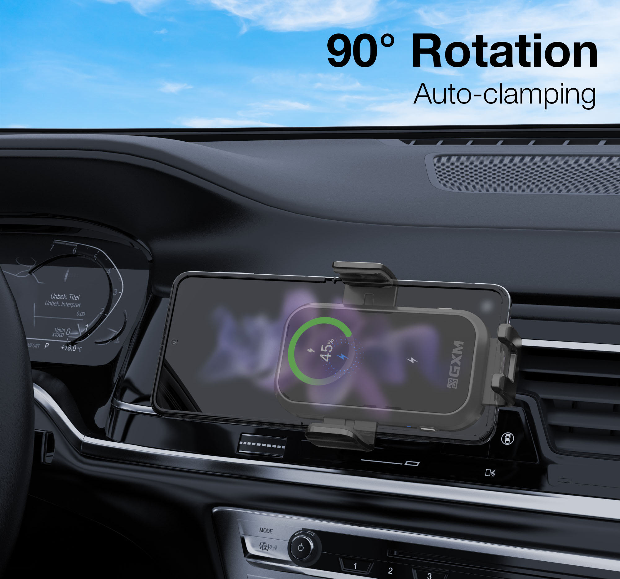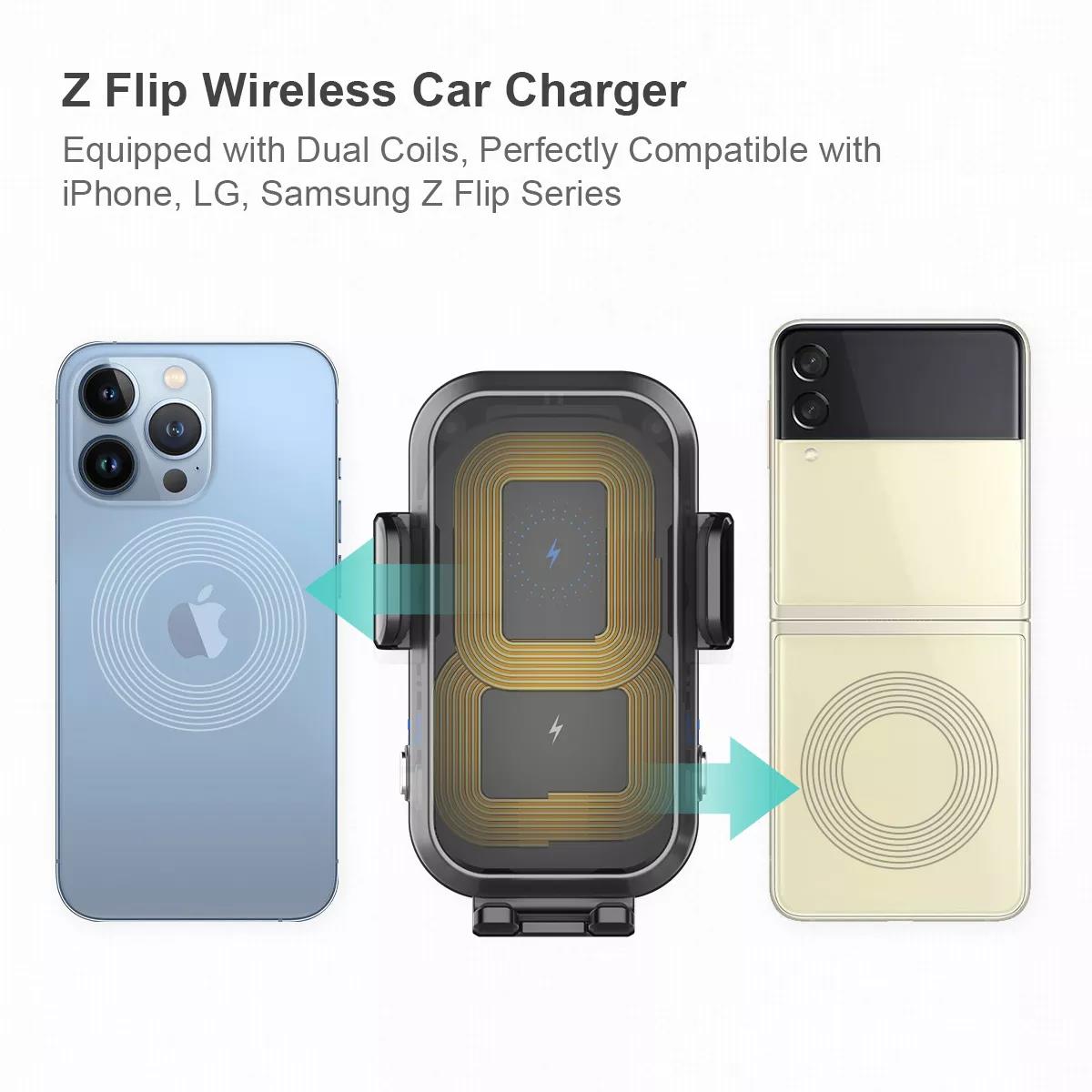GXM CH01 15W Dual Coil Car Wireless Charger Phone Holder Compatible with Samsung Z Flip Series Three Axis Multi-angle Rotation Auto Clamping Car Phone Holder