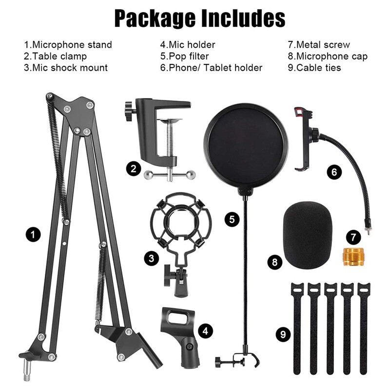 [Flexibility & Applicability] The microphone boom arm can rotate 360 degrees left and right and Move up and down 180°. With its upgraded clamp and protective cushion, the microphone arm fits on tables up to 2.1 inches thick.This mic boom arm set also includes a 3/8inch to 5/8inch screw adapter to suit most microphones. The mic stand can work perfectly with Blue Snowball and most other microphones.